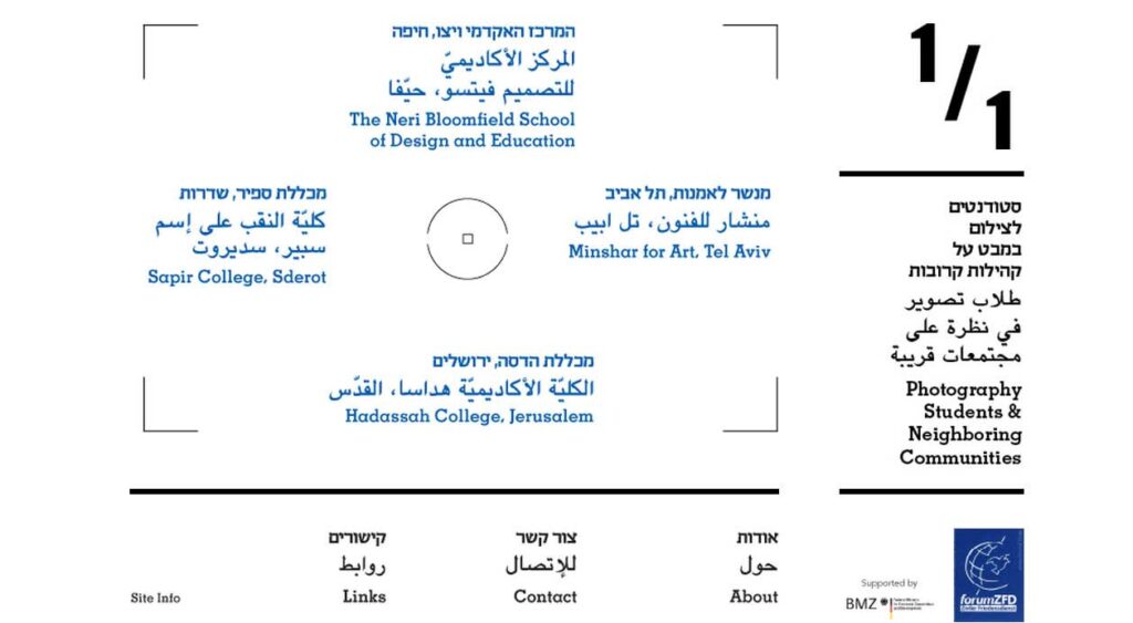 one divided by one, 2011 The exhibition and website one divided by one features the works of students from four art academics in Israel; Hadassah College, Jerusalem; Minshar for Art, Tel Aviv; The Neri Bloomfield School for Design and Education, Haifa and Sapir College, Sderot. The diversity of the works on display reflects student’s encounters with various communities in Israel.